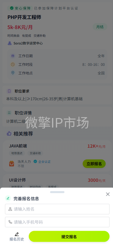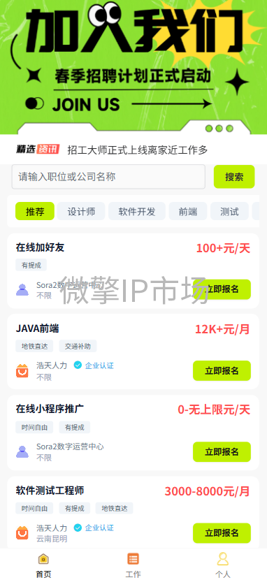 适用于企业招工、零工、小时工、在线招工等场景,目前支持后台发布工作前端报名,后期会迭代手机端企业认领和招工发布